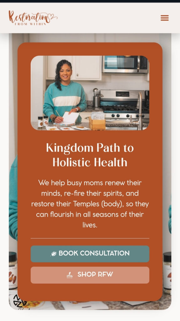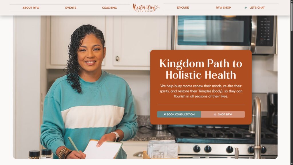Restoration From Within had developed a powerful methodology for helping moms achieve holistic health, but the business lacked the professional brand presence and operational infrastructure to reach more women who needed support. Managing coaching clients, product inventory, recipes and meal plans, customer communications, and e-commerce operations through disconnected systems was limiting growth.